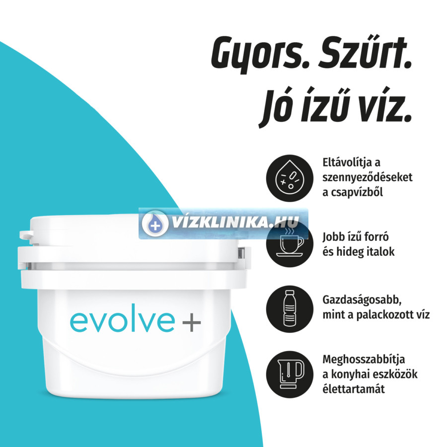 A csomag tartalma: 1db kancsó + 3 x 30 nap/100 liter Evolve+ szűrőbetét